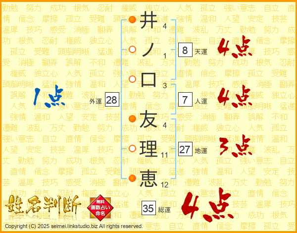 井(4画)ノ(1画)口(3画) 友(4画)理(11画)恵(12画)
