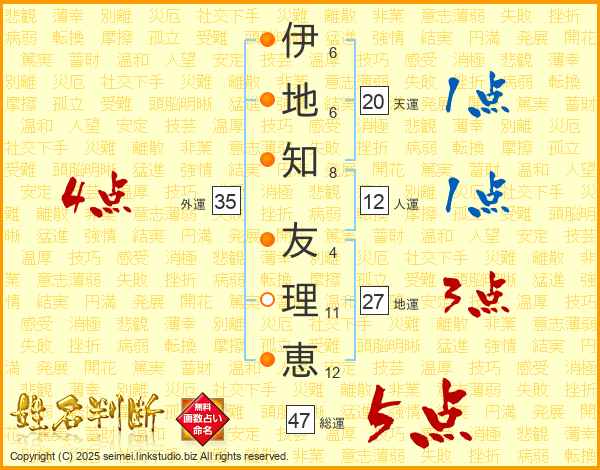 伊(6画)地(6画)知(8画) 友(4画)理(11画)恵(12画)