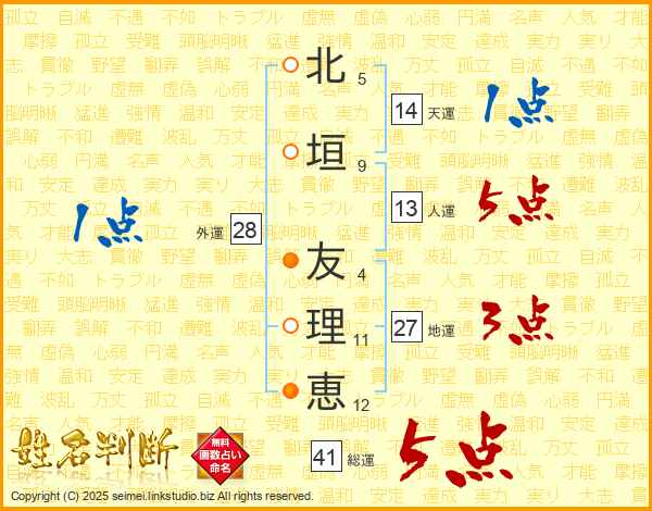北(5画)垣(9画) 友(4画)理(11画)恵(12画)