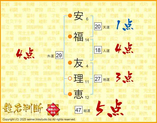 安(6画)福(14画) 友(4画)理(11画)恵(12画)