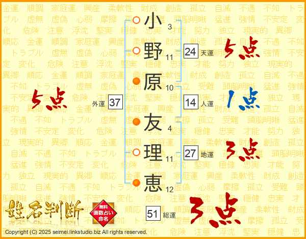 小(3画)野(11画)原(10画) 友(4画)理(11画)恵(12画)