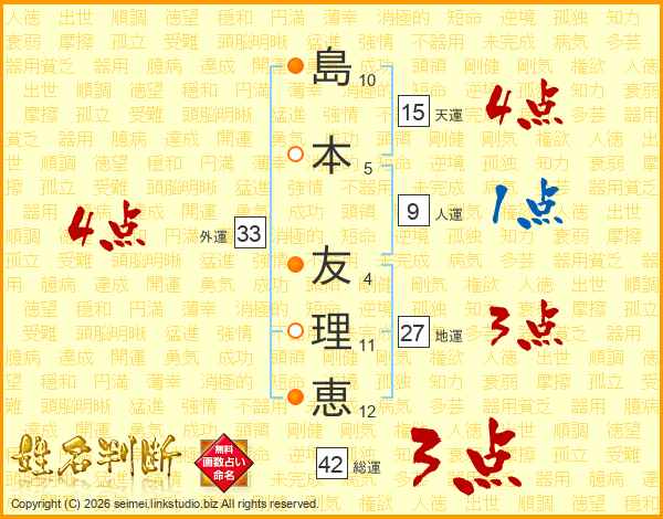島(10画)本(5画) 友(4画)理(11画)恵(12画)