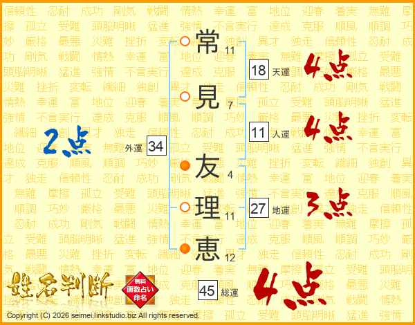 常(11画)見(7画) 友(4画)理(11画)恵(12画)