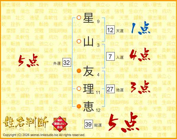 星(9画)山(3画) 友(4画)理(11画)恵(12画)
