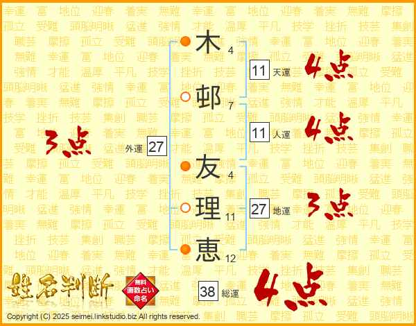 木(4画)邨(7画) 友(4画)理(11画)恵(12画)