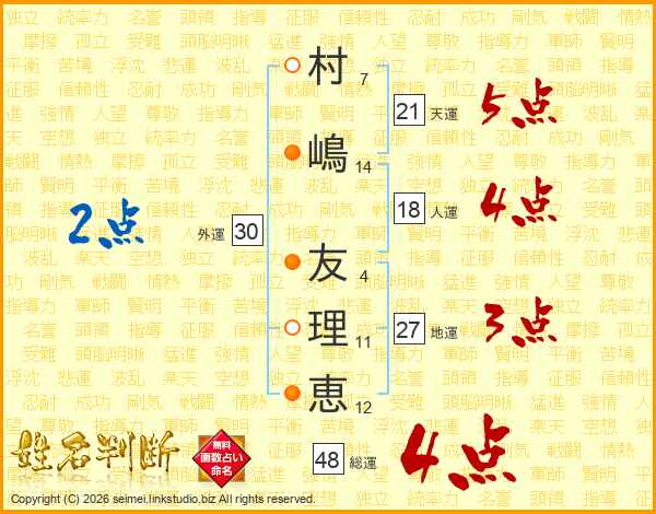村(7画)嶋(14画) 友(4画)理(11画)恵(12画)