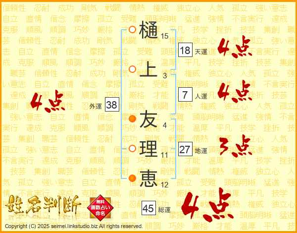 樋(15画)上(3画) 友(4画)理(11画)恵(12画)