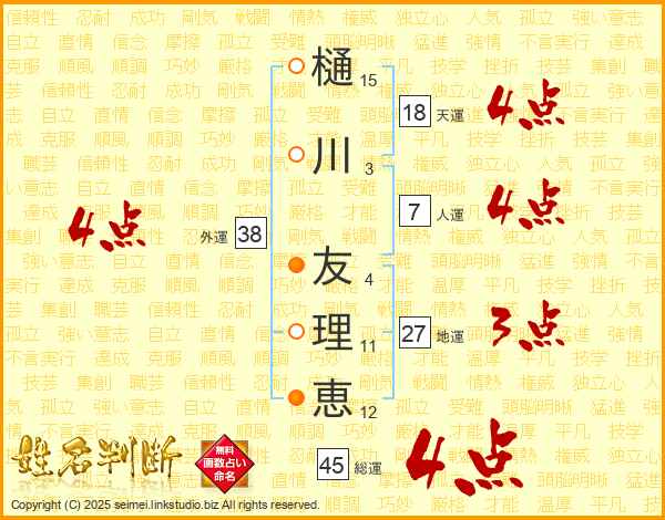 樋(15画)川(3画) 友(4画)理(11画)恵(12画)