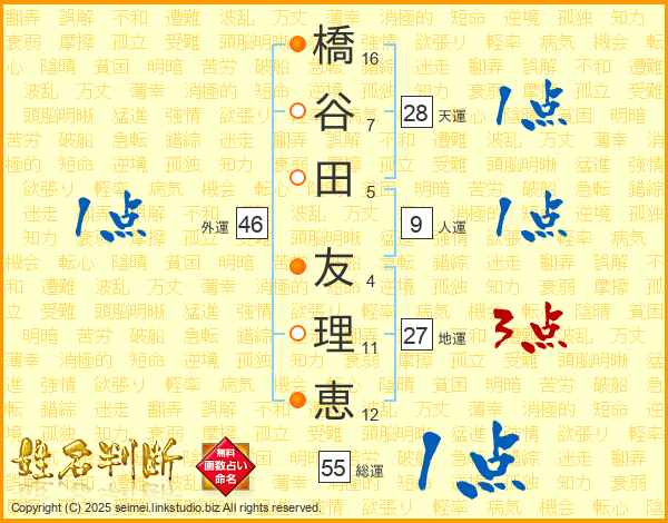 橋(16画)谷(7画)田(5画) 友(4画)理(11画)恵(12画)