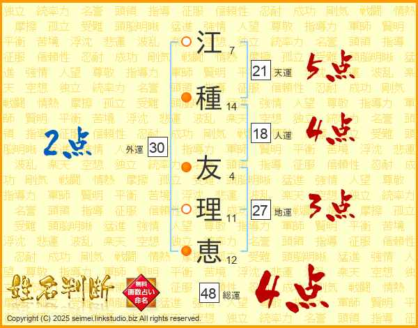 江(7画)種(14画) 友(4画)理(11画)恵(12画)