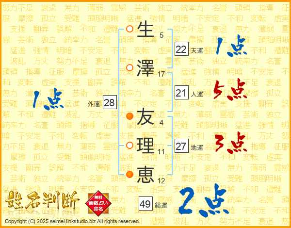 生(5画)澤(17画) 友(4画)理(11画)恵(12画)