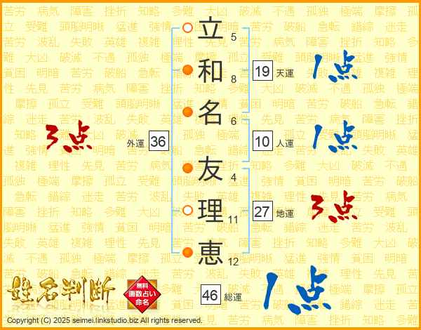 立(5画)和(8画)名(6画) 友(4画)理(11画)恵(12画)