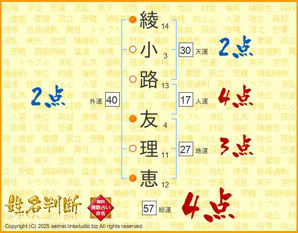 綾(14画)小(3画)路(13画) 友(4画)理(11画)恵(12画)