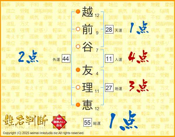 越(12画)前(9画)谷(7画) 友(4画)理(11画)恵(12画)