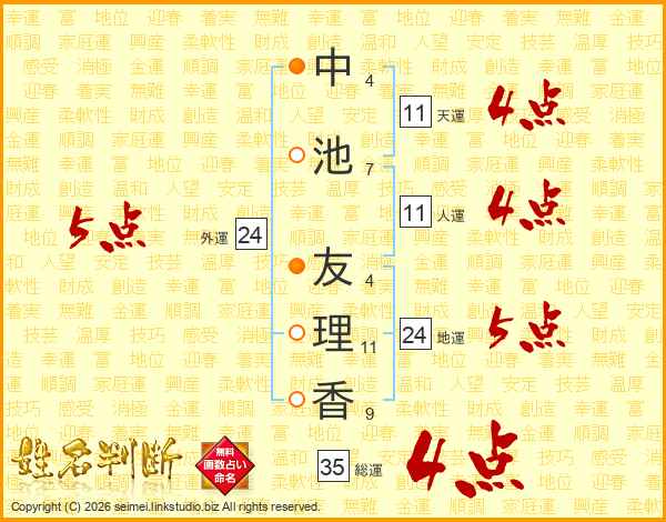 中(4画)池(7画) 友(4画)理(11画)香(9画)