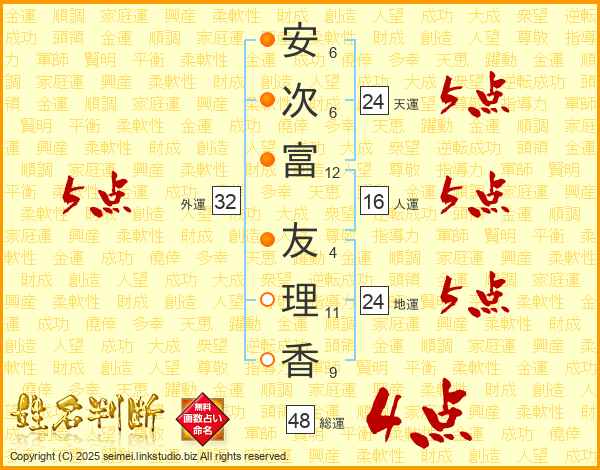 安(6画)次(6画)富(12画) 友(4画)理(11画)香(9画)