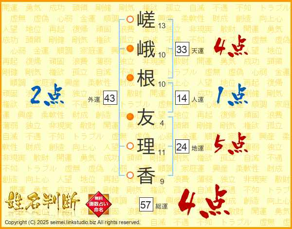 嵯(13画)峨(10画)根(10画) 友(4画)理(11画)香(9画)