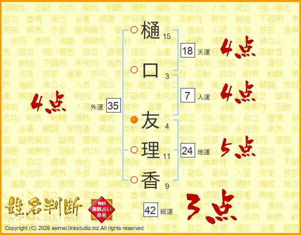 樋(15画)口(3画) 友(4画)理(11画)香(9画)