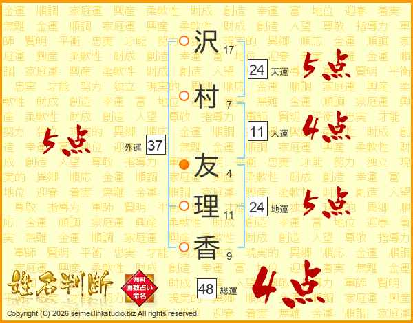 沢(17画)村(7画) 友(4画)理(11画)香(9画)
