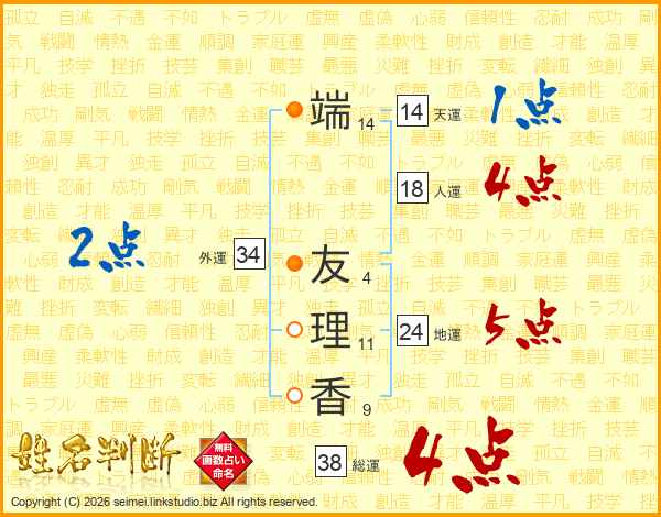 端(14画) 友(4画)理(11画)香(9画)
