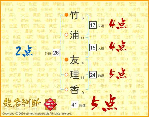 竹浦友理香さんの総運は41画の5点!