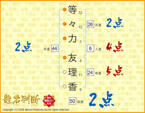 等(12画)々(12画)力(2画) 友(4画)理(11画)香(9画)