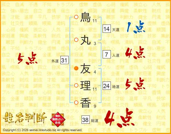 鳥(11画)丸(3画) 友(4画)理(11画)香(9画)