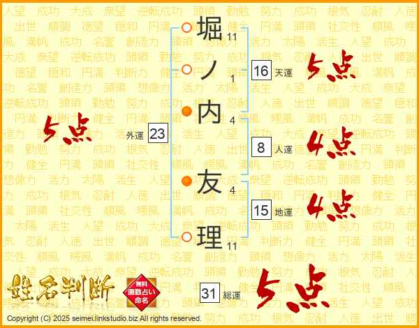 堀(11画)ノ(1画)内(4画) 友(4画)理(11画)