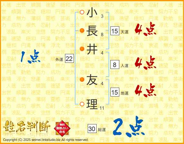 小長井友理さんの天運は15画の4点!