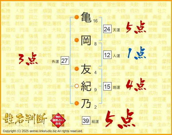 亀(16画)岡(8画) 友(4画)紀(9画)乃(2画)