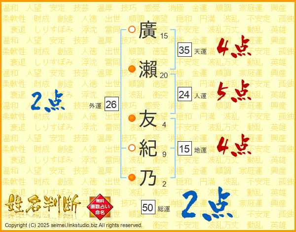 廣(15画)瀨(20画) 友(4画)紀(9画)乃(2画)