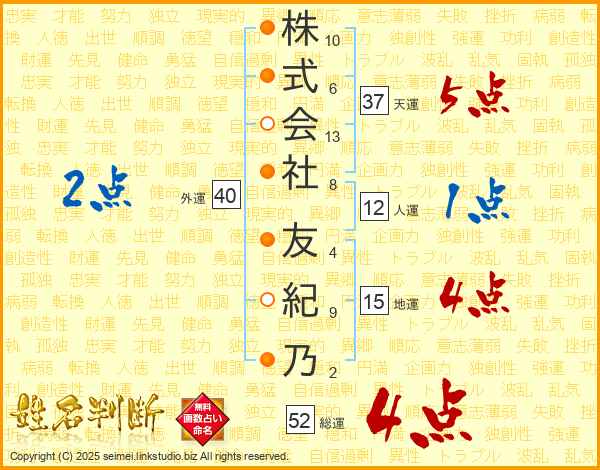 株(10画)式(6画)会(13画)社(8画) 友(4画)紀(9画)乃(2画)