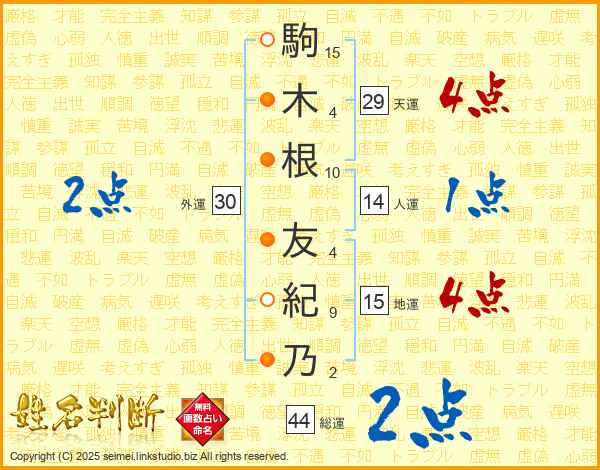 駒(15画)木(4画)根(10画) 友(4画)紀(9画)乃(2画)