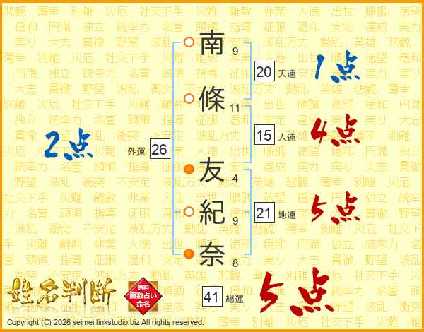 南(9画)條(11画) 友(4画)紀(9画)奈(8画)