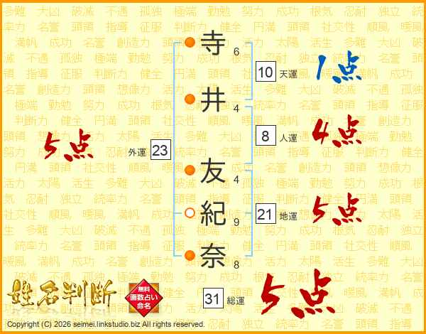 寺(6画)井(4画) 友(4画)紀(9画)奈(8画)