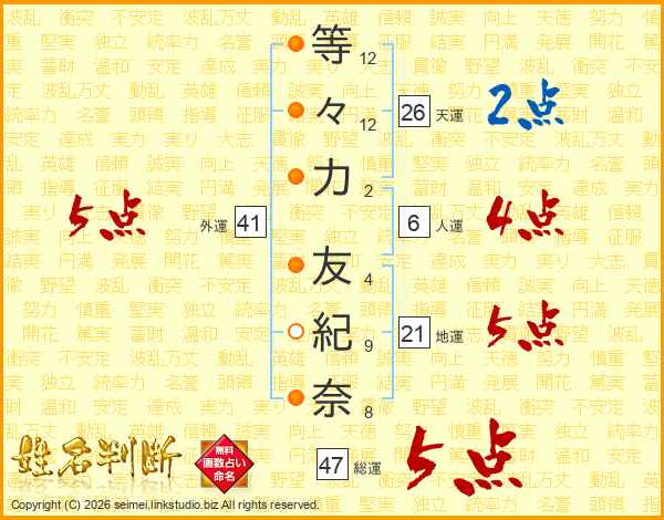 等(12画)々(12画)力(2画) 友(4画)紀(9画)奈(8画)