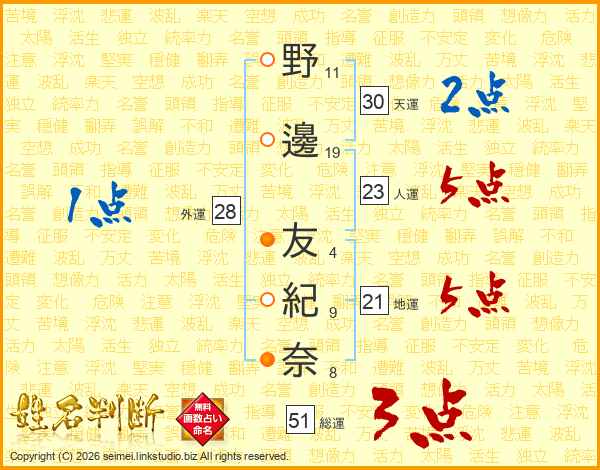 野(11画)邊(19画) 友(4画)紀(9画)奈(8画)