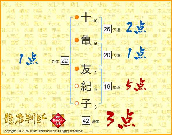 十(10画)亀(16画) 友(4画)紀(9画)子(3画)