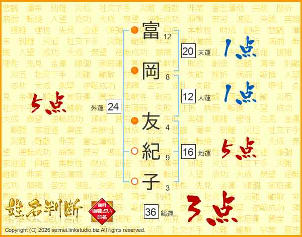 富(12画)岡(8画) 友(4画)紀(9画)子(3画)