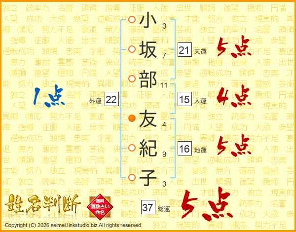 小坂部友紀子さんの総運は37画の5点!