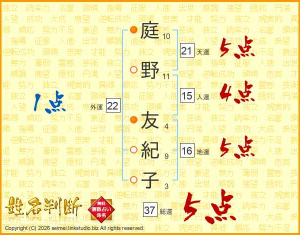 庭(10画)野(11画) 友(4画)紀(9画)子(3画)