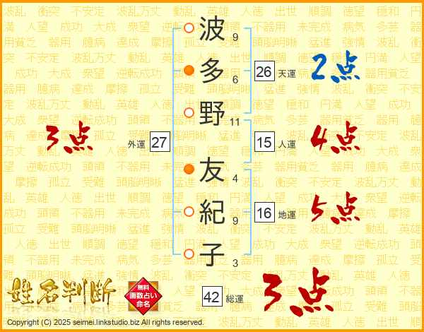 波(9画)多(6画)野(11画) 友(4画)紀(9画)子(3画)