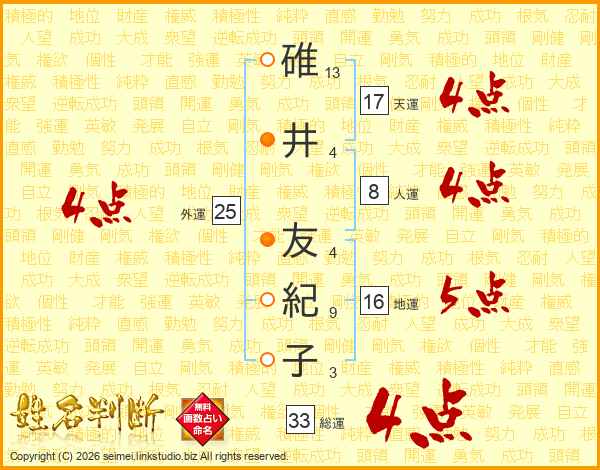 碓井友紀子さんの総運は33画の4点!