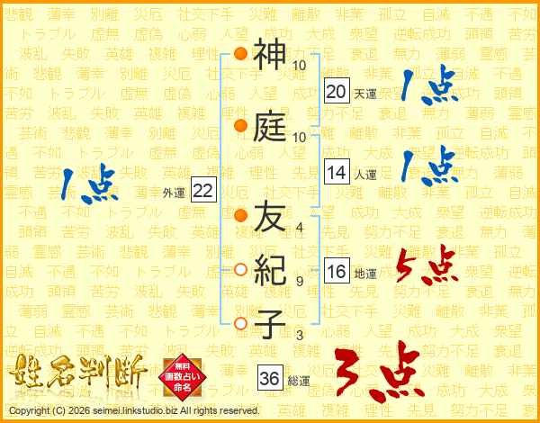 神(10画)庭(10画) 友(4画)紀(9画)子(3画)