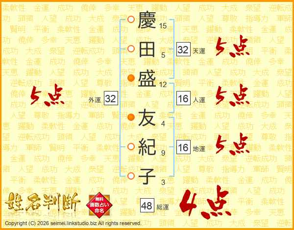 慶(15画)田(5画)盛(12画) 友(4画)紀(9画)子(3画)