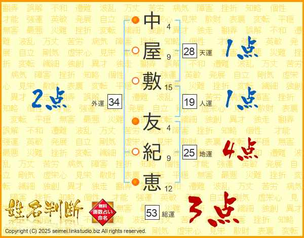 中(4画)屋(9画)敷(15画) 友(4画)紀(9画)恵(12画)