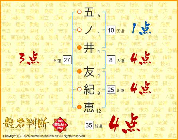 五(5画)ノ(1画)井(4画) 友(4画)紀(9画)恵(12画)