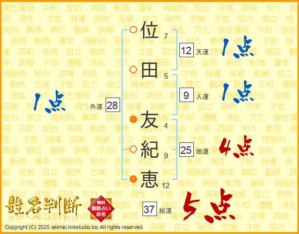 位(7画)田(5画) 友(4画)紀(9画)恵(12画)