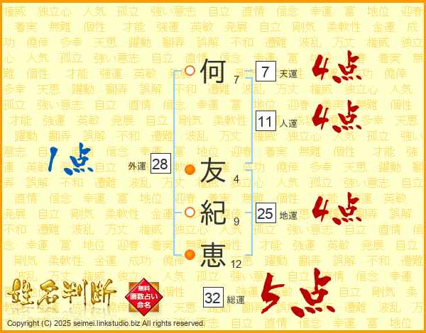 生活面を象徴する運勢です。外部から受ける影響力を表し、結婚運、家庭運や職場、環境への順応性を表します。総運から人運を引いた画数。姓や名が1文字の場合を除く。