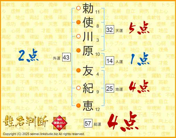 勅(11画)使(8画)川(3画)原(10画) 友(4画)紀(9画)恵(12画)